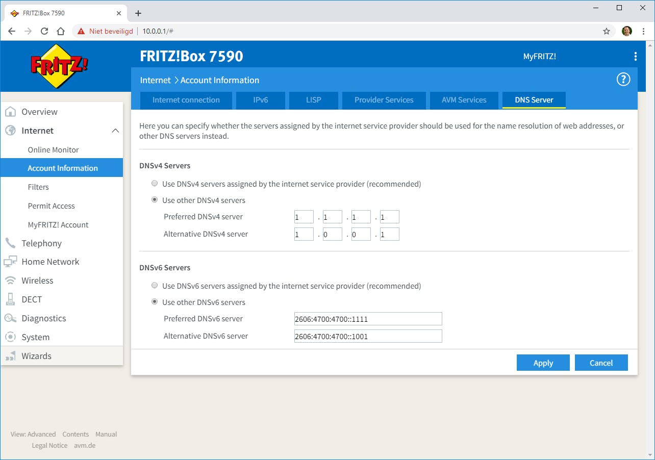 Voor het vertalen van namen op internet naar ip-adressen wordt een dns-server gebruikt. De meeste apparaten gebruiken gewoon de standaard toegewezen dns-server van de internetprovider, maar je kunt naar voorkeur ook een andere, openbare dns-provider instellen. Zulke openbare dns-providers handelen verzoeken vaak sneller af en bieden doorgaans een betere privacy, omdat ze bijvoorbeeld geen log van je dns-verzoeken bijhouden. Ook bieden ze extra bescherming tijdens het surfen, bijvoorbeeld door het blokkeren van onveilige websites met malware en dnssec (zie tip 11). Bekende voorbeelden van snelle en betrouwbare openbare dns-providers zijn CloudFlare, Google DNS en Quad9. Hoewel je de dns-server op individuele apparaten kunt wijzigen, is het handiger dit in één keer voor al je apparaten te regelen via de routerinstellingen. Nemen we een Fritz!Box als voorbeeld, dan open je hiervoor eerst de configuratiepagina in je browser en blader je naar Internet / Account Information / DNS Server. Vul voor IPv4 bijvoorbeeld de adressen 1.1.1.1 en 1.0.0.1 in (CloudFlare). Als jouw provider en router IPv6 ondersteunen (en die kans is tegenwoordig vrij groot), doe je hetzelfde voor de IPv6-dns-servers. Voor CloudFlare zijn die adressen 2606:4700:4700::1111 en 2606:4700:4700::1001.