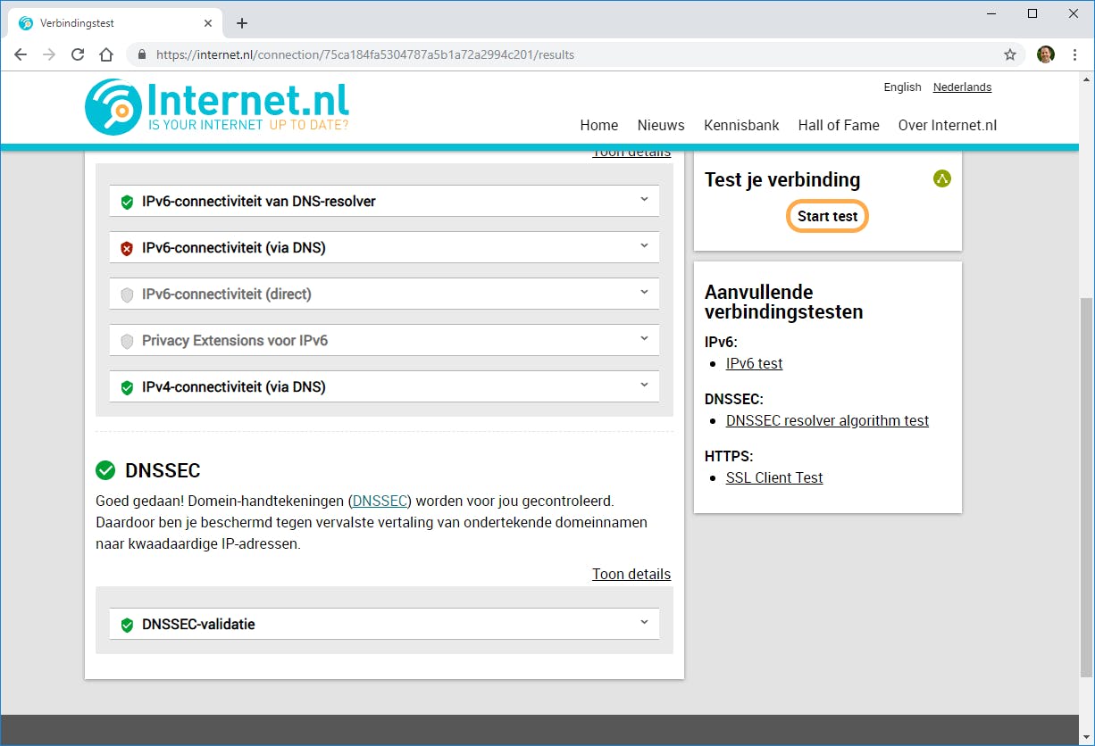 Het zal je maar gebeuren: je tikt het webadres van je bank in, maar komt op een namaakwebsite die er precies op lijkt, maar erop gericht is informatie van je af te troggelen. De kans op zulke manipulatie is vrij klein als je het juiste adres gebruikt, maar het bestaat wel, en heet met een mooi woord dns-spoofing. Gelukkig bestaat er met dnssec (voluit Domain Name Security Extensions) een soort handtekening of echtheidskenmerk voor domeinnamen. Een dns-server kan met deze informatie controleren of je inderdaad naar de juiste website wordt gestuurd. De openbare dns-servers benutten deze veiligheidsvoorziening vrijwel allemaal, maar veel Nederlandse internetproviders blijven achter. XS4ALL ondersteunt het al wel maar KPN en Ziggo nog niet. Met een eenvoudige check controleer je eenvoudig en snel of je beschermd wordt door validatie van dnssec-handtekeningen. Als dat niet het geval is, zou je kunnen overwegen om de dns-serveradressen aan te passen (zie tip 10).