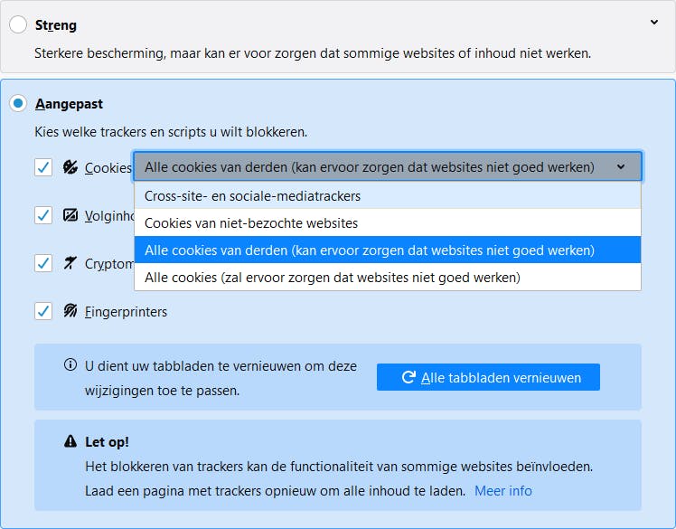Standaard worden cookies van derden toegelaten, zowel in Chrome als in Firefox. In Chrome blokkeer je die als volgt: tik chrome://settings/content/cookies in de adresbalk in en zet de schakelaar bij Indirecte cookies blokkeren op Uit. Deze functie kun je ook via het menu bereiken, ga dan via de drie puntjes naar Instellingen / Geavanceerd / Privacy en beveiliging / Site-instellingen / Cookies en sitegegevens. In Firefox voer je about:preferences#privacy in of navigeer je via het hamburgermenu naar Opties / Privacy & Beveiliging waar je bij Browserprivacy de optie Aangepast aankruist. We raden je aan hier alle opties aan te vinken. Specifiek bij Cookies kun je dan Alle cookies van derden selecteren. Levert dat te veel problemen op bij het surfen, kies dan Cross-site en sociale-mediatrackers.