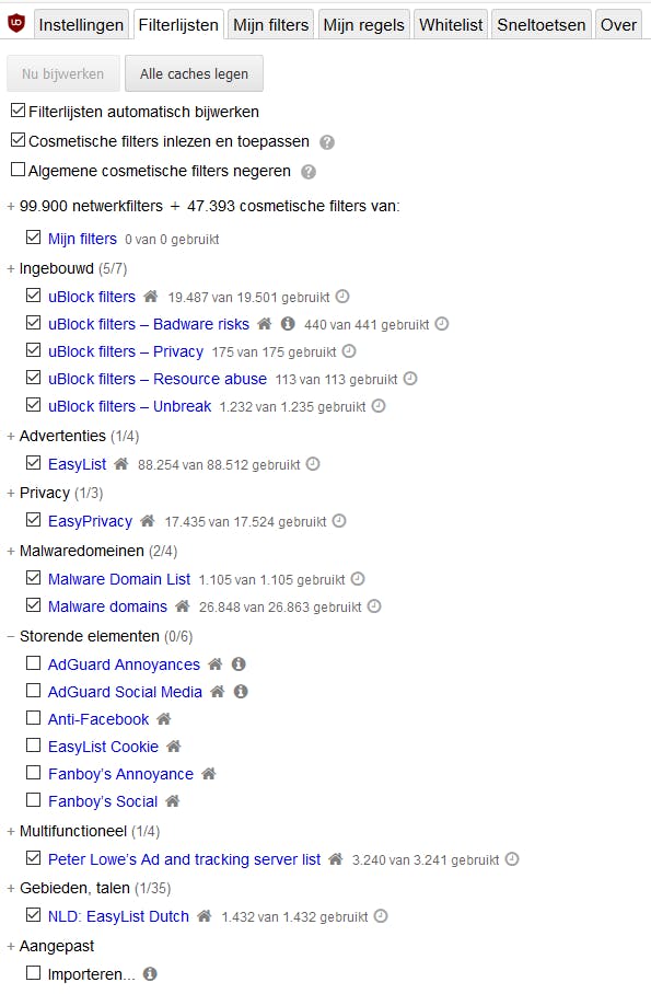 Grover geschut is dus nodig, in de vorm van een advertentie- en contentblocker. Een van de betere is uBlock Origin, beschikbaar als plug-in voor Chrome en Firefox. uBlock Origin werkt op basis van filterlijsten en standaard zijn al talrijke domeinen geblokkeerd. Je beheert de plug-in vanuit het dashboard: klik op het bijhorende pictogram rechts van de adresbalk en vervolgens op het knopje met de schuifregelaars. Open het tabblad Filterlijsten en laat bij voorkeur de vinkjes bij alle filterlijsten staan.
