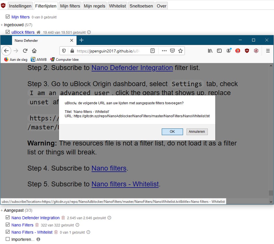 Gebeurt het je naar je zin te vaak dat er op websites geen content weergegeven wordt omdat je een adbocker geïnstalleerd hebt? Dan kun je dat tegengaan door een anti-adblock-blocker als Nano Defender te installeren in Chrome of in Firefox. Om Nano Defender in uBlock Origin te integreren, moet je wel nog een aantal stappen uitvoeren, zoals hier beschreven. Voer alle instructies nauwgezet uit vanuit de browser waarop je zowel uBlock Origin als Nano Defender hebt geïnstalleerd. Bij Step 3 dien je dus het tabblad Instellingen in het dashboard van uBlock Origin te openen en een vinkje te plaatsen bij Ik ben een ervaren gebruiker. Vervolgens klik je op het tandwielpictogram achter dit item en vervang je unset in de onderste regel bij userResourcesLocation door wat er genoemd staat. Bevestig de aanpassingen door de knop Wijzigingen toepassen in te drukken. De andere stappen spreken voor zich. Wanneer je vervolgens het tabblad Filterlijsten opent, zul je bij Aangepast drie Nano-filters zien verschijnen.