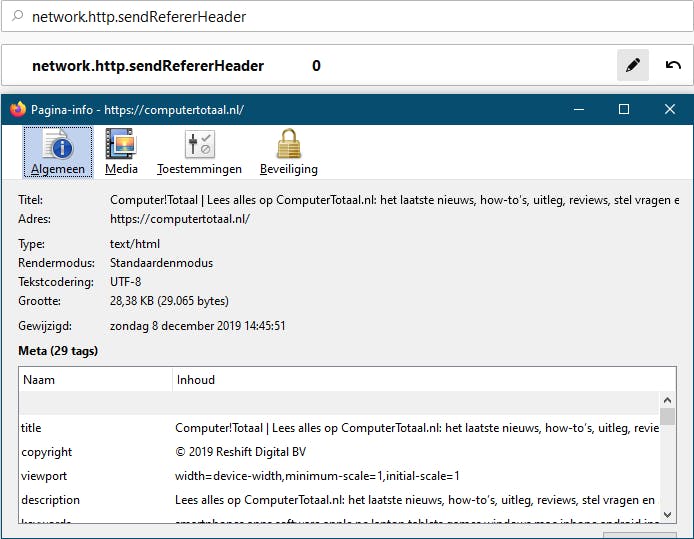 Even een klein experiment: start Firefox, surf naar www.google.nl, voer ‘computer!totaal’ in en klik op de link die naar de website van Computer!Totaal leidt. Rechtsklik vervolgens op een lege plek op die webpagina en kies Pagina-info bekijken. Bij Verwijzende URL lees je nu https://www.google.nl. Dat is de zogenoemde referer die via de http-headers standaard naar een bezochte website wordt doorgestuurd. Deze praktijk is wel bedenkelijk voor je privacy, want niet alleen de website weet nu waar je vandaan komt, maar ook de eventuele advertentie- of socialmedia-netwerken die content hebben staan op die webpagina. Zo’n url kan trouwens extra gevoelige informatie bevatten – wat dacht je bijvoorbeeld van deze referer: https://www.healthcare.gov/seeplans/85601/results/?county=04019&age=40&smoker=1&pregnant=1&zip=85601&state=AZ&income=35000’?