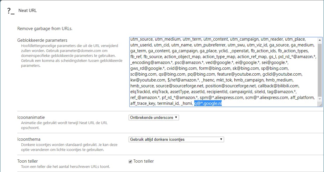 De browserplug-ins ClearURLs en Neat URL, beschikbaar voor zowel Chrome als Firefox, strippen zulke parameters uit de url voordat die aan de webserver wordt doorgegeven. We bekijken hier kort Neat URL. Na de installatie is de plug-in automatisch actief. Om hier nog wat aan aan te passen, klik je op het bijhorende pictogram met de rechtermuisknop en kies je Preferences. Op het tabblad Opties zie je bij Geblokkeerde parameters een overzicht van de parameters en kun je er zelf eigen parameters aan toevoegen, weliswaar volgens bepaalde regels. Je dient je wijzigingen te bevestigen met Voorkeuren opslaan. Voeg je hier bijvoorbeeld paramnaam aan toe, dan zal deze parameter uit elke url worden geweerd. Een item als q@*.google.nl zorgt ervoor dat de parameter q uitsluitend in google.nl, weliswaar inclusief subdomeinen (*), wordt opgeruimd. Dit is echter geen voorbeeld om zelf te implementeren, want hierdoor zullen je zoekopdrachten in www.google.nl niet langer werken.