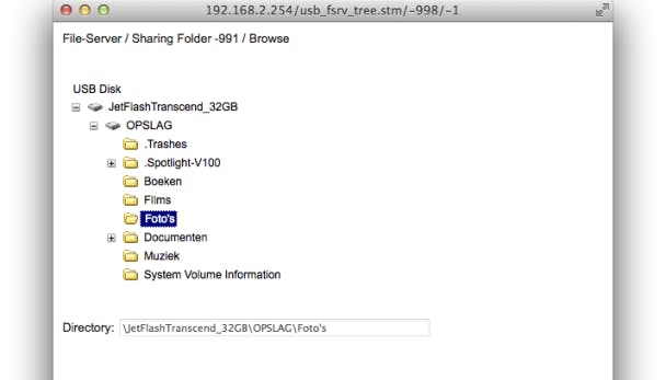 Maak nu een hoofdmap aan op het opslagmedium. Dit is de naam die je straks op het netwerk ziet. Binnen deze map kun je naar eigen inzicht submappen aanmaken. Wij maken een hoofdmap genaamd Gedeeld aan, met daaronder submappen met namen als Foto's, Films en Documenten. Vervolgens kopieer je de gewenste bestanden naar de usb-stick, bijvoorbeeld de foto's en filmpjes van je vakantie. Zodra alles wat je wilt delen op het opslagmedium staat, koppel je hem los van de pc en plaats je hem in een usb-poort van de router. Vervolgens keer je terug naar de browser.