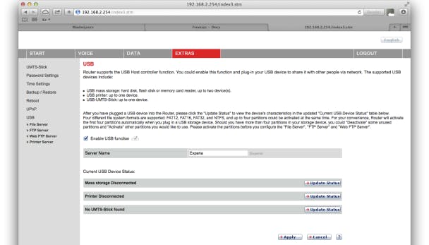 Eenmaal via de browser aangemeld op de Experia-box gaan we naar tabblad Extra's en vervolgens kiezen we in de grijze kolom aan de linkerzijde voor de optie USB. Op dit scherm activeren we allereerst de opslagmogelijkheid van de router door een vinkje te zetten bij de optie Enable USB function. Vul in het veld Server Name eventueel nog een naam in voor de NAS of laat de standaardnaam staan die er al staat. Klik vervolgens op de knop Apply om de wijzigingen door te voeren.