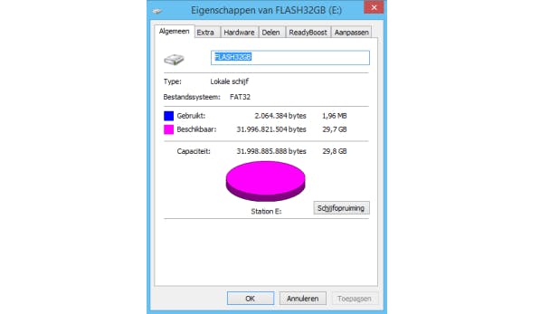 Het opslagmedium dat je aan de router koppelt, kun je vooraf alvast vullen met bestanden. Dat gaat sneller met je computer dan wanneer de opslag in de router zit en alles via het (draadloze) netwerk verzonden moet worden. Wij gebruiken een lekker ruime usb-stick van 32 gigabyte. Controleer wel even of de usb-stick of schijf juist is geformatteerd. Start Windows Verkenner, klik met rechts op het opslagmedium, kies Eigenschappen en kijk op tabblad Algemeen wat er achter Bestandssysteem staat. Als er FAT, FAT16, FAT32 of NTFS staat is er niets aan de hand. Want daar kan een router prima mee overweg.