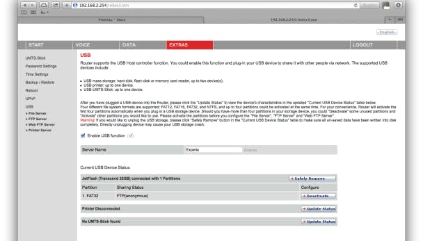 Op de pagina uit tip 3 waar je de usb-functie hebt geactiveerd, klik je in het onderdeel Current USB Device Status bij Mass storage Disconnected op de knop Update Status. De usb-stick of schijf moet nu herkend worden. Nu de opslag succesvol met je router is verbonden, ben je bijna klaar. Wat nog wel moet gebeuren, is het starten en configureren van een bestandsserver, ook wel file server. Die zorgt ervoor dat je bestanden bereikbaar zijn via het netwerk.