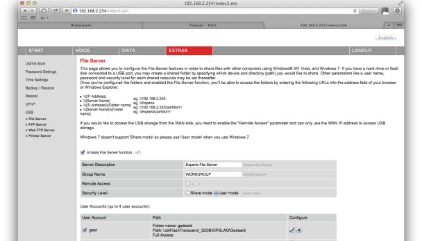Om de bestandsserver te starten, ga je opnieuw naar tabblad Extra's. Klik links op USB en vervolgens op File Server. Zet een vinkje bij Enable File Server function en klik op Apply. Vervolgens geef je aan welke hoofdmap je met het netwerk wilt delen. Controleer eerst dat bij Security Level de optie User mode geactiveerd is. Klik dan in het onderdeel User Accounts aan het uiteinde van de lege regel op het pagina-pictogram (onder het kopje Configure). Bedenk een gebruikersnaam en wachtwoord, die gegevens heb je straks nodig om via het netwerk bij de opslag te komen.