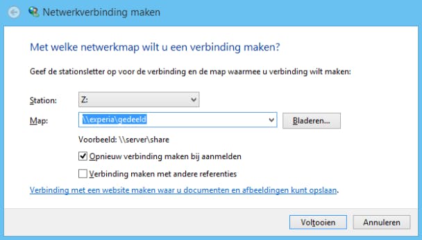 Eindelijk is het zover. De gedeelde opslagruimte is nu bereikbaar vanuit het thuisnetwerk. Start op een computers de Windows Verkenner op. Klik in de navigatiekolom met rechts op het kopje Netwerk en kies Netwerk verbinding maken. Een nieuw venster opent. Kies bij Station een schijfletter uit en vul bij Map de netwerknaam van de gedeelde map als volgt in: \\server\map. Stel dat de file server Experia heet en de hoofdmap Gedeeld, dan wordt het netwerkadres: \\experia\gedeeld. Klik op Voltooien.