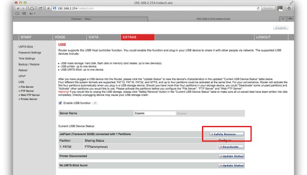 Zorg eerst dat de opslag niet in gebruik is op de computer(s). Ga dan weer in de browser naar de pagina met instellingen van de router. Op tabblad Extra's klik je op USB. In het onderdeel Current USB Device Status klik je achter het opslagmedium op Safely Remove. Pas zodra de router dit aangeeft, kun je de usb-stick of de schijf veilig loskoppelen.
