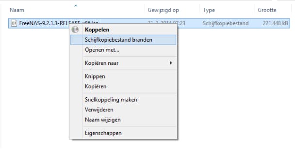 Wat je binnenhaalt is een iso-bestand. De bedoeling is namelijk dat je computer die je wilt omtoveren tot NAS, met deze software gaat opstarten. In plaats van Windows, zal er dan FreeNAS op gaan draaien. Om zover te komen moet je wel een aantal stappen zorgvuldig doorlopen. Allereerst brand je het iso-bestand op een cd-schijfje. In Windows 8 kan dit eenvoudig door met rechts op het bestand te klikken en de optie Schijfkopiebestand branden te kiezen. In een nieuw venster selecteer je bij Cd/dvd-brander de cd-speler. Plaats een lege cd in de cd-speler en klik op Branden. In oudere Windows-versies heb je een hulpprogramma nodig om het image op een cd te branden. Gebruik bijvoorbeeld het gratis ImgBurn. Zodra het branden klaar is, heb je een opstartbare cd. Haal hem alvast uit de cd-speler.