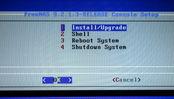 Zodra de pc vanaf de cd opstart, ben je een flink eind op weg. Er rollen een tijdlang ingewikkelde en onbegrijpelijke teksten over het scherm. Hier hoef je niet op te letten. Als alles goed gaat, verschijnt er uiteindelijk een menu op het scherm. Krijg je geen menu te zien? Of verschijnen er bij het opstarten slechts een paar regeltjes op het scherm en stopt alles dan ineens? Dan is FreeNAS blijkbaar niet geschikt voor deze pc. Lukt het wel, dan kies je in het menu voor optie 1 Install/upgrade. Dat doe je door op cijfertoets 1 te drukken. Controleer daarna eerst of de knop OK geselecteerd is. Zo niet, dan gebruik je de pijltjestoetsen om dat alsnog te doen. Druk dan op Enter.