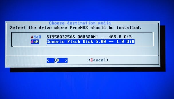 Tip 16 Selecteer de usb-stick om FreeNAS op te installeren.
