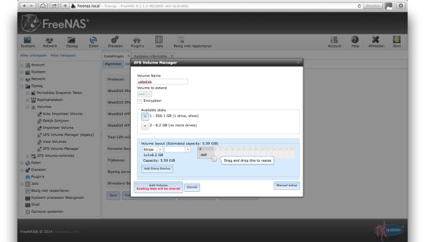 We voeren eerst een gebruiker in via Account / Gebruikers / Gebruiker Toevoegen. Vul (alleen) een gebruikersnaam, de volledige naam en twee keer het wachtwoord in en klik op OK. Zorg dat de usb-stick of schijf waarop je bestanden gaat plaatsen, op de FreeNAS-pc is aangesloten voordat je verdergaat. Voeg dat opslagmedium vervolgens als een zogenaamd volume aan FreeNAS toe via Opslag / Volumes / ZFS Volume Manager. Geef een volumenaam op. Klik dan bij Available disks op het plusteken van de usb-stick (of schijf) waarop straks de bestanden komen. Die opslagruimte komt vervolgens in het kader Volume layout te staan. Klik tot slot op de knop Add Volume, waarna de schijf geformatteerd wordt. Dit duurt even.