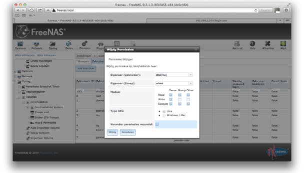 Wanneer de schijf geformatteerd is, kunnen we de daarnet aangemaakte gebruiker toegang tot dit volume geven. Dat doe je door onder Opslag / Volumes op het plusteken voor het aangemaakte volume te klikken en daarna op Wijzig Permissies er vlak onder. Verander het veld Eigenaar (gebruiker) in de daarnet door jou aangemaakte gebruikersnaam. Standaard staat hier namelijk root, dit is de machtigste gebruiker van dit systeem en dat is niet nodig. Zet ook een vinkje bij Verander permissies recursief. Klik op Wijzig om de gewijzigde permissies op te slaan. Er zijn enorm veel mogelijkheden om de toegang tot mappen en bestanden heel specifiek in te stellen, maar voor dit artikel volstaat deze methode.
