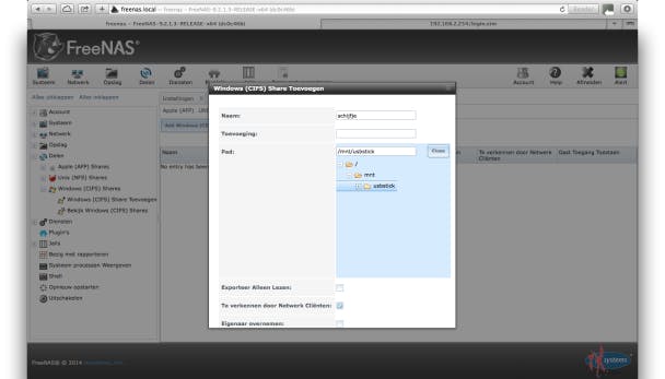 Omdat we de schijf via Windows-computers willen benaderen, moet er ook nog een speciale service genaamd CIFS gestart worden. Klik hiertoe boven in het venster op het pictogram met tandwielen waarin Diensten staat. Klik dan op de schakelaar achter CIFS zodat deze van OFF naar ON gaat. Tot slot moet een share worden aangemaakt. Dat is de naam waaronder de schijf in het netwerk te zien zal zijn. Dit doe je via Delen / Windows (CIFS) Shares / Windows (CIFS) Share Toevoegen. Tik een naam in en klik achter Pad op de knop Browse. Wijs het daarnet aangemaakte volume aan. Die bevindt zich onder /mnt. Bijvoorbeeld /mnt/usbstick. Klik op OK.