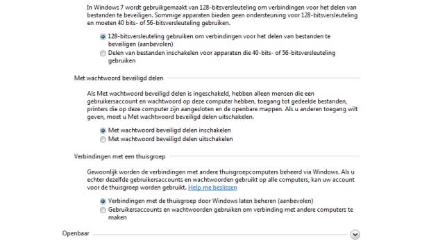 Wil je liever niet dat andere gezinsleden onbeperkt toegang hebben tot de gedeelde map(pen)? Geen probleem, want je schermt de boel eenvoudig af met het wachtwoord van je Windows-gebruikersaccount. Ga in het configuratiescherm achtereenvolgens naar Netwerk en internet / Netwerkcentrum / Geavanceerde instellingen voor delen wijzigen. Controleer vervolgens of de optie Met wachtwoord beveiligd delen inschakelen is geactiveerd.