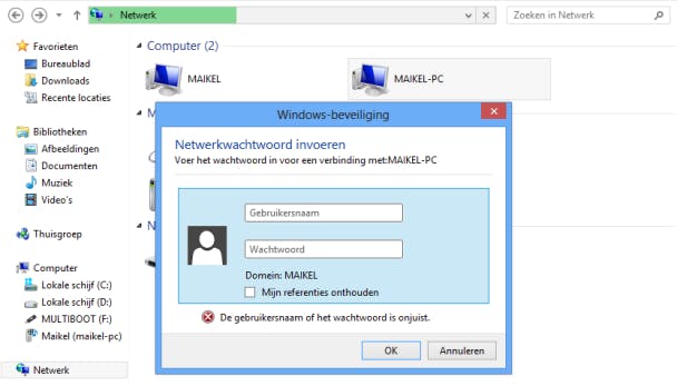 De instellingen van de gedeelde map bepalen of je een gebruikersnaam en wachtwoord moet invullen.