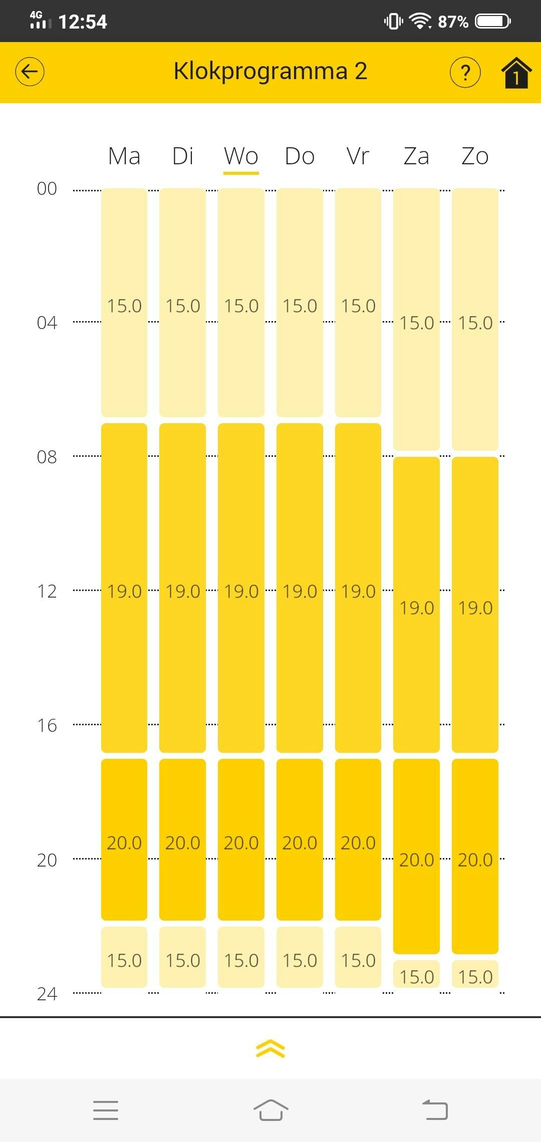 Je ziet wanneer je de app opent de temperatuur die de thermostaat nu is groot in beeld. Je kunt op het zwarte bolletje drukken en deze een bepaalde kant op slepen om de thermostaat handmatig op een andere temperatuur te zetten. Dit blijft dan zo, tenzij je een klokprogramma hebt ingesteld. Klokprogramma’s zorgen ervoor dat de verwarming het huis de gewenste temperatuur maakt op vastgestelde momenten. Weet je bijvoorbeeld dat je maandag en dinsdag van 8 tot 6 niet thuis bent, dan kun je de thermostaat dan laag laten staan op 15 tot 17 graden. Werk je woensdagen altijd thuis, dan wil je die tijd dat je huis wordt verwarmd.