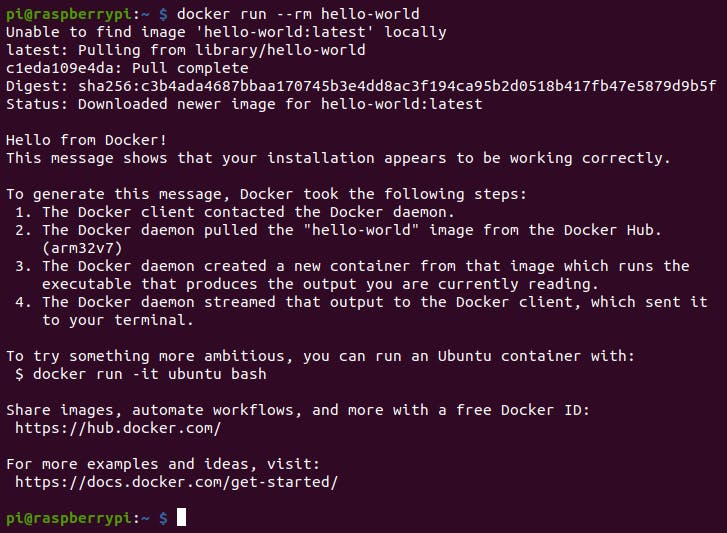 Met deze opdracht draai je de Docker-container hello-world. Deze container toont in zijn uitvoer wat er exact gebeurt: het image wordt niet op je Raspberry Pi gevonden en wordt dan door Docker van de Docker Hub gedownload. Daarna maakt Docker een container op basis van dit image en voert het programma erin uit. Door de optie --rm wordt de container na het afsluiten van het programma opgeruimd. Je weet nu dat Docker correct geïnstalleerd is en werkt.