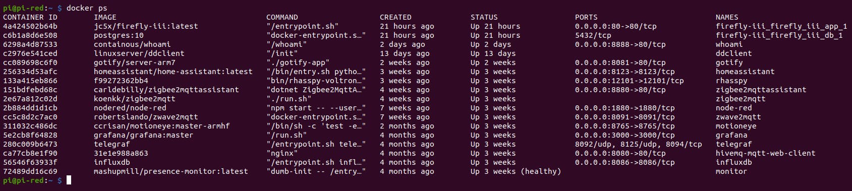 In de kolom PORTS zie je de gebruikte poorten. Voor onze container whoami staat daar bijvoorbeeld 0.0.0.0:8888->80/tcp. Dat betekent dat tcp-poort 8888 op de Raspberry Pi wordt omgeleid naar tcp-poort 80 op de container. In de laatste kolom zie je de naam van de container, die kun je in verdere Docker-opdrachten gebruiken.