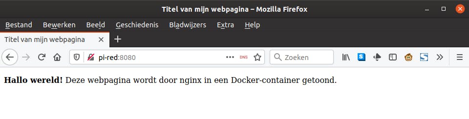 Daarna start de container met de webserver op en koppelt die de directory /home/pi/containers/nging/data op je Raspberry Pi in de container aan op de locatie /usr/share/nginx/html, met alleen leesrechten (ro staat voor read-only). Als je nu surft naar IP:8080 krijg je het html-bestand index.html te zien.