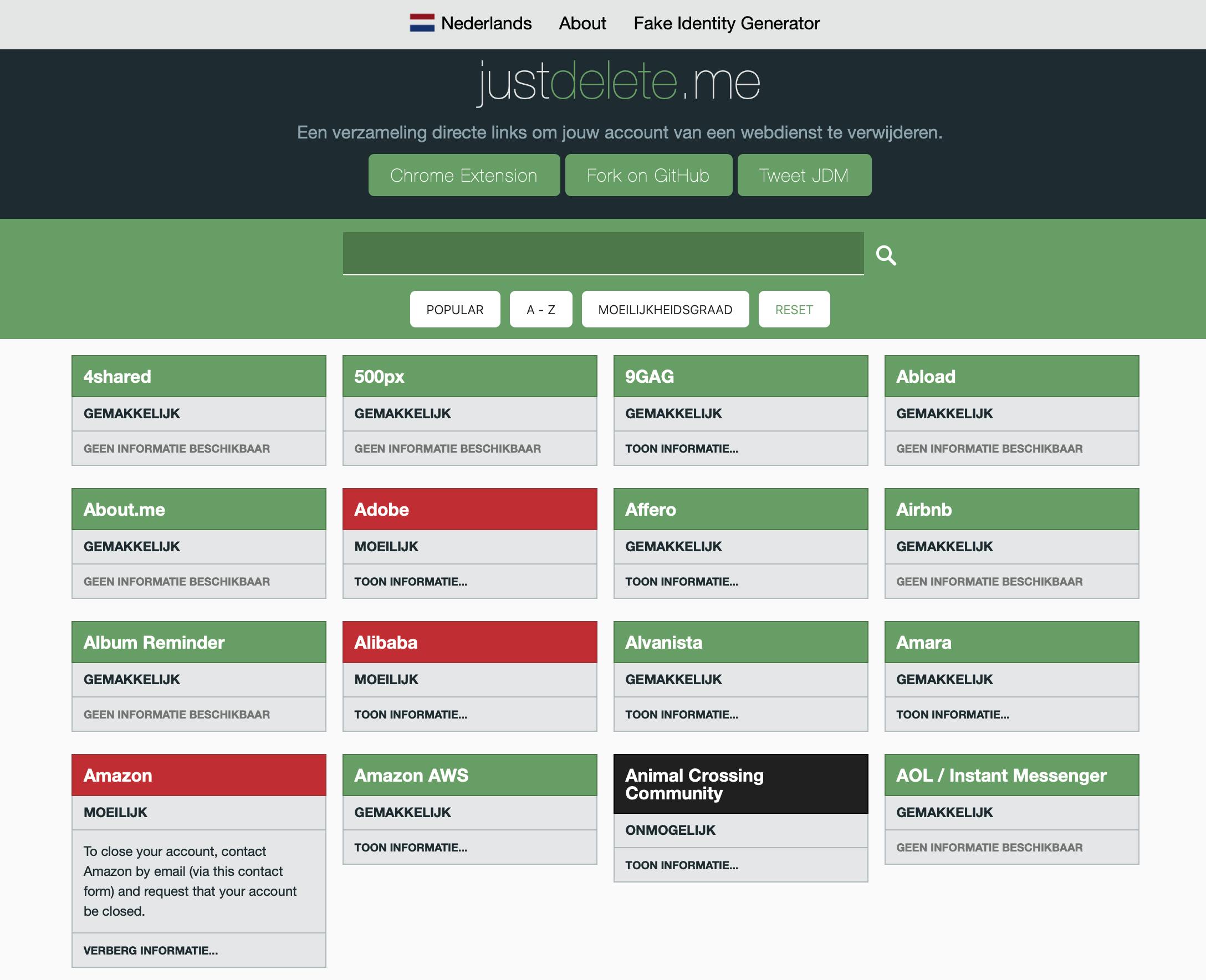 Het opzet van Just Delete Me! is erg eenvoudig. Hier kom je bij een website die een grote verzameling heeft aangelegd van websites en -diensten waarvan je waar je je moet registreren. Iedere website heeft hier een kleurcode. Groen betekent dat het account bij deze onlinedienst makkelijk te verwijderen is, oranje geeft aan het iets moeilijker is om uit te schrijven en sites die rood zijn gekleurd maken je het echt moeilijk om gedag te zeggen. Sommige diensten zijn zelfs zwart gemarkeerd, daar is het volgens Just Delete Me! ronduit onmogelijk om vanaf te komen.