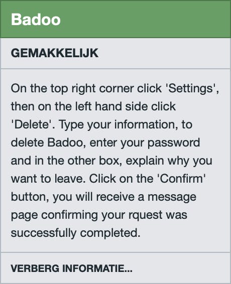 Bovenaan in Just Delete Me wijzig je de taalinstelling en bij de mogelijkheden vind je ook het Nederlands. Daaronder staat een zoekvak om een bepaalde website op naam te zoeken. Je kunt de enorme verzameling webdiensten rangschikken volgens populariteit, alfabet of moeilijkheidsgraad. In de laatste optie heb je de keuze tussen gemakkelijke, gemiddelde, moeilijke en onmogelijke uitschrijfprocedures. Heb je de dienst gevonden die je kwijt wilt, dan klik je op Toon informatie. Ook al heb je het Nederlands in de taalinstellingen geselecteerd, in dit venstertje lees je altijd in het Engels wat je moet doen om het lidmaatschap in te trekken.