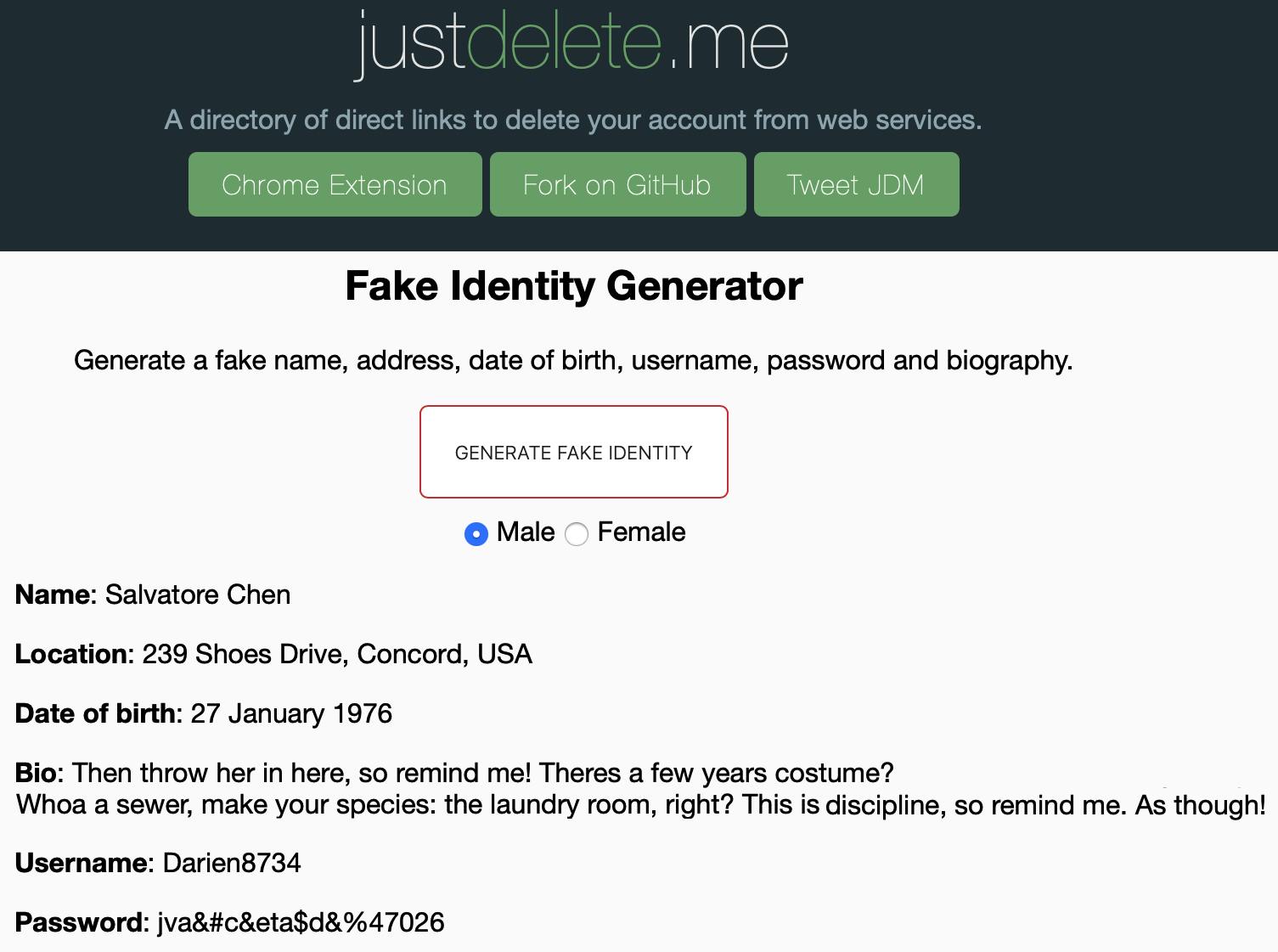 Bovenaan vind je trouwens een link die je bij een Chrome-extensie brengt. Als die is geïnstalleerd, beschik je over een knopje in de Google-browser dat uitschrijven nog gemakkelijker maakt. Wanneer je dan op een website komt die op de lijst van Just Delete Me! staat, hoef je alleen op de knop te klikken zodat je rechtstreeks op de verwijderpagina van de betrokken website komt. Tenslotte vind je bovenaan ook een knop naar de Fake Identity Generator die voor jou een valse naam, adres, geboortedatum, gebruikersnaam en wachtwoord aanmaakt die je kunt gebruiken wanneer je overweegt je aan te melden op een website die je niet helemaal vertrouwt.