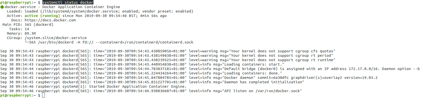 Als je geen foutmelding op het einde van de installatie van Docker zag, log dan uit met exit; zag je wel een foutmelding, herstart je Pi dan met reboot. Log daarna weer in via ssh. In de uitvoer van onderstaand commando zou nu active (running) moeten staan: