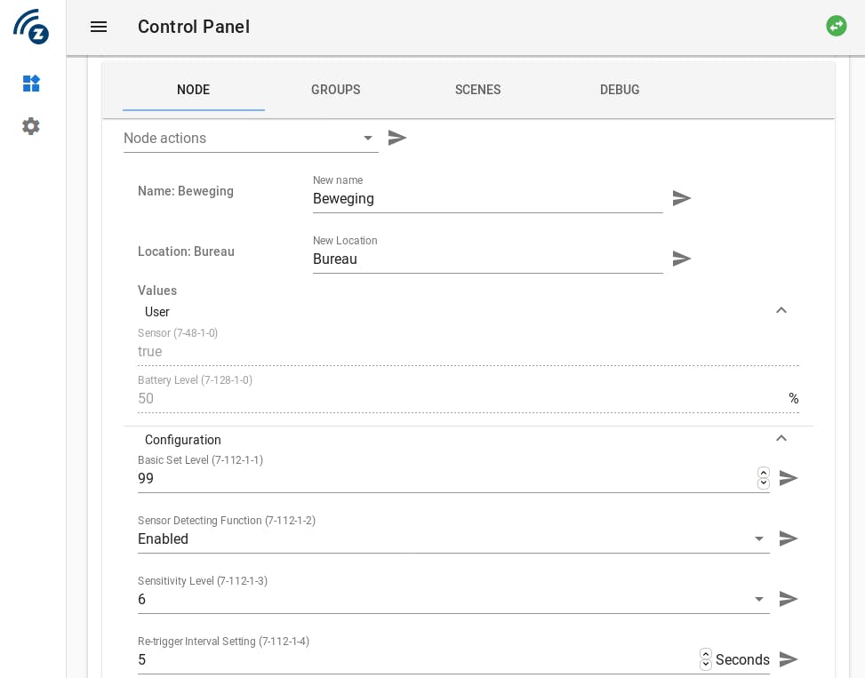 Je kunt je apparaat ook een naam en locatie geven. Vul deze in en klik op het pijltje ernaast. Als je in de gatewayconfiguratie Use nodes name instead of numeric nodeIDs ingeschakeld hebt, wordt deze leesbare naam gebruikt om het apparaat in de mqtt-berichten en in het bedieningspaneel te identificeren. Tot slot kun je ook nog acties op een apparaat uitvoeren. Kies daarvoor de gewenste actie bij Node actions en klik op het pijltje ernaast.