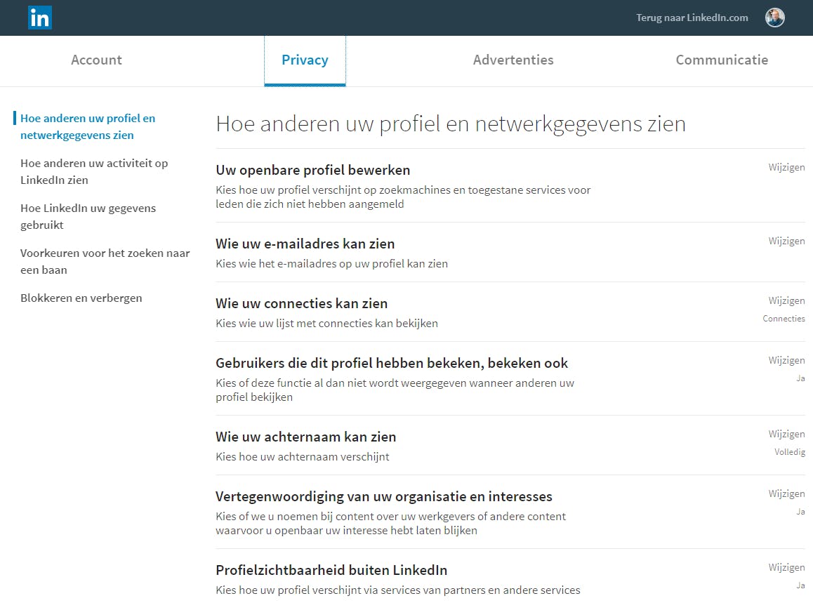 Wanneer je inlogt bij LinkedIn, klikt op de profielfoto en daarna op Instellingen en privacy, dan word je naar een pagina gebracht met bijzonder veel instellingen, onderverdeeld in vier tabbladen. In het tweede tabblad, Privacy, kun je precies aangeven welke informatie anderen mogen zien in je LinkedIn-profiel. Zo kun je hier bepalen of informatie uit je profiel weergegeven mag worden in zoekmachines, of men je e-mailadres mag zien, en zelfs of mensen je achternaam mogen zien. We raden aan om dit gedeelte heel zorgvuldig te doorlopen om je profiel precies zo vorm te geven als je prettig vindt.