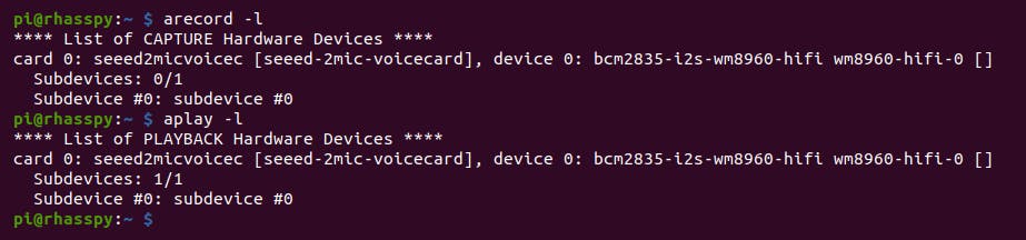 Herstart daarna je Raspberry Pi met sudo reboot. Als je daarna weer inlogt, zou je in de uitvoer van de commando’s arecord -l (de lijst van microfoons) en aplay -l (de lijst van luidsprekers) de ReSpeaker-hardware moeten zien.