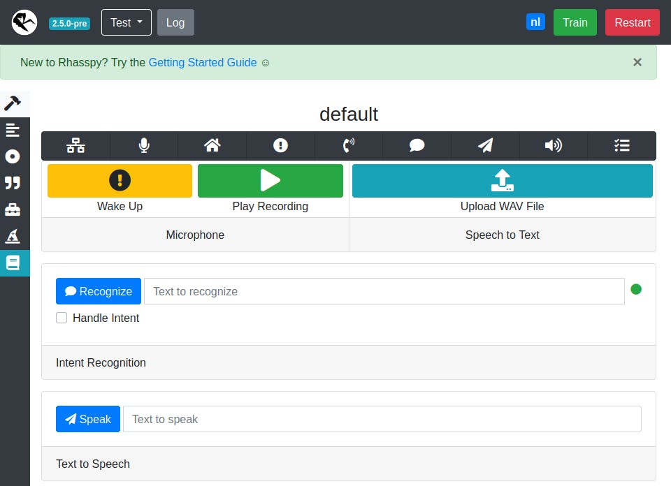 Maak de Docker-container van Rhasspy met het commando docker-compose up -d. Nadat Rhasspy is opgestart, kun je de webinterface bereiken via http://IPADRES:12101 met in plaats van IPADRES het werkelijke ip-adres van je Raspberry Pi. Dat laatste kom je te weten met de opdracht ip a op je Pi. Kijk naar het ip-adres bij eth0 als je ethernet gebruikt of wlan0 als je wifi gebruikt. In de webinterface zie je rechts bovenaan in het blauw nl staan: dat is het teken dat Rhasspy het Nederlandse profiel gebruikt. Je ziet bovenaan ook een link naar de Getting Started Guide: de documentatie wordt gewoon door dezelfde webserver getoond.