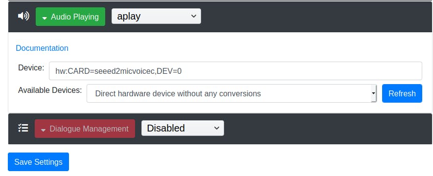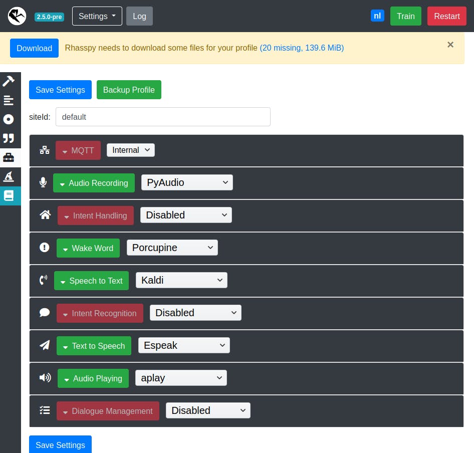 Klik links op het icoontje van de gereedschapskist. Je krijgt nu alle services van Rhasspy te zien en die zijn standaard allemaal uitgeschakeld. Rhasspy is eigenlijk een toolkit om een stemassistent mee te maken en voor elk van deze services heb je meerdere keuzes. Selecteer PyAudio bij Audio Recording, en aplay bij Audio Playing. Klik onderaan op Save Settings, waarna Rhasspy herstart. Klik op Audio Recording / Test en kies de microfoon, bijvoorbeeld seeed-2mic-voicecard. Klik op Audio Playing en Refresh en kies je luidspreker, bijvoorbeeld Direct hardware device without any conversions. Sla je wijzigingen nog eens op.