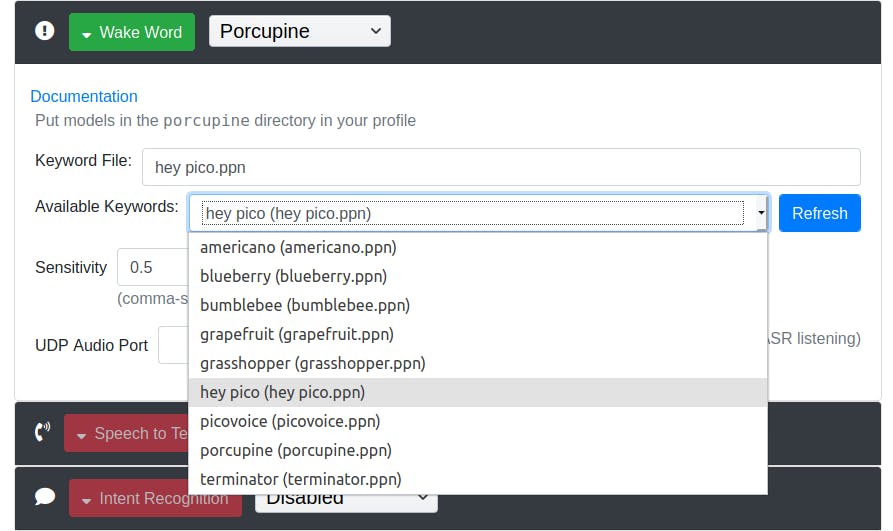 In de volgende stap kies je een ‘wake word’: het woord dat je tegen Rhasspy dient te zeggen om je stemassistent te activeren. Selecteer Porcupine bij Wake Word en sla je wijzigingen op. Klik dan op Wake Word en Refresh. In de lijst voor de knop Refresh kun je nu uit een tiental activatiewoorden kiezen, zoals porcupine (de standaard) en hey pico. Als je je eigen activatiewoord wilt aanmaken, dan kan dat met de Picovoice Console. Maak een directory genaamd porcupine in je profielmap van Rhasspy en plaats het bestand daar. Daarna kun je het in de instellingen selecteren. Vergeet niet op Save Settings te klikken.