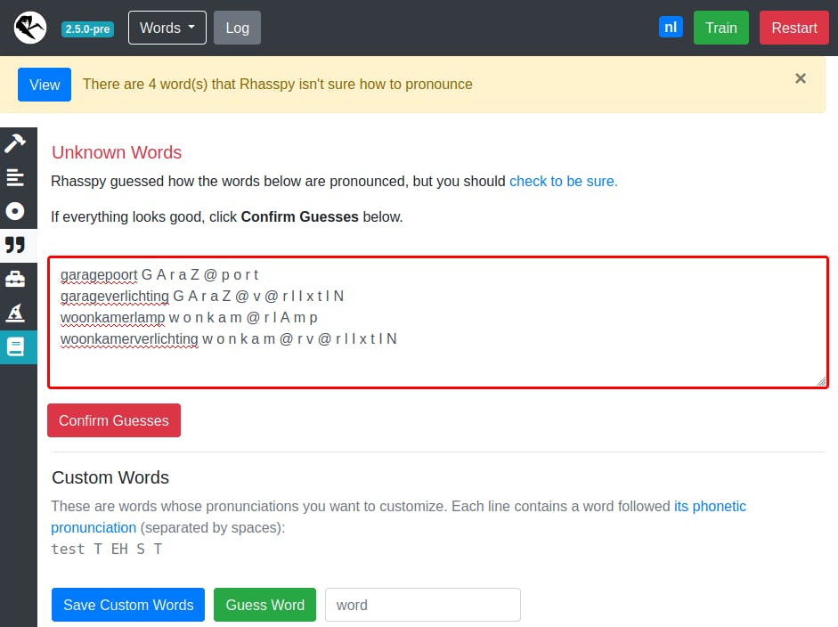 Klik op View bij de melding over onbekende woorden of klik in de zijbalk links op het icoontje met de twee aanhalingstekens. Rhasspy heeft al een gok gedaan over de uitspraak van de onbekende woorden, door er hun fonetische transcriptie bij te zetten. Klik op check to be sure om de beschikbare fonemen te bekijken. Klopt er iets niet, pas dit dan aan. Klik tot slot op Confirm Guesses. De woorden worden dan samen met hun uitspraak toegevoegd aan je lijst met Custom Words. Merk je later dat je een verkeerde uitspraak hebt toegevoegd, dan kun je deze altijd op deze pagina nog aanpassen.