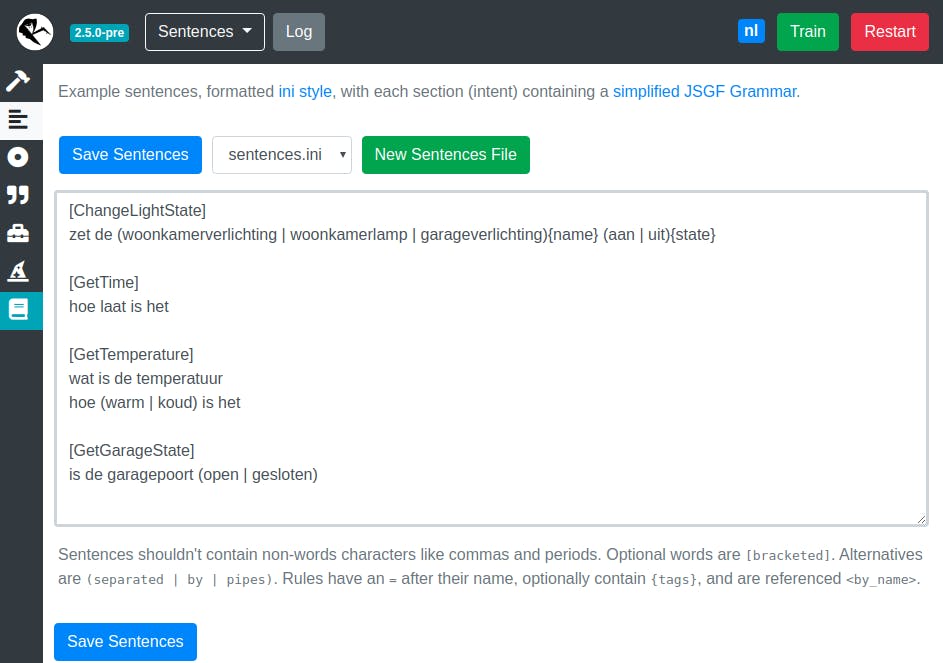 Dan rest er nog één component die we moeten instellen: Intent Recognition. Stel die in op Fsticuffs en sla je wijzigingen op. Na de herstart zou Rhasspy je opdrachten moeten herkennen. Welke zinnen Rhasspy exact herkent, vind je op de pagina Sentences. De inhoud daarvan heeft de syntaxis van een ini-bestand, en elke sectie is een ‘intent’ of bedoeling. Bekijk bijvoorbeeld de regel [GetTime] met daarna de regel hoe laat is het. Dat betekent: als je de zin “hoe laat is het” uitspreekt, verstaat Rhasspy dit als de bedoeling GetTime. Je kunt hier ook complexere regels invullen, op de pagina staat een link naar de volledige syntaxis.