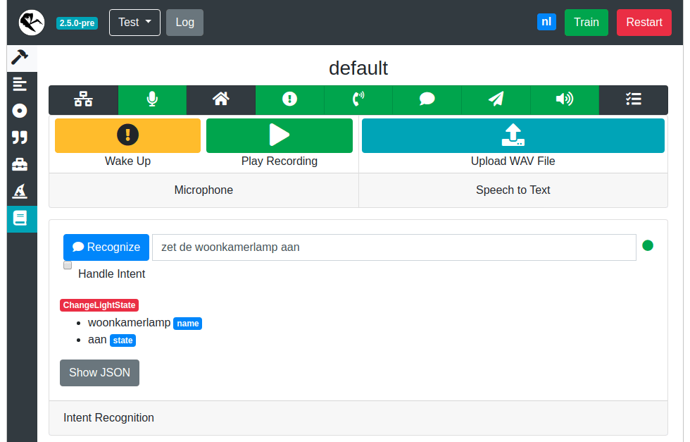 Ga nu naar de pagina Test en typ een van de zinnen uit de pagina Sentences in het tekstveld naast Recognize. Klik op de knop ernaast. Als je bijvoorbeeld “zet de woonkamerlamp aan” invoert, verschijnt er na een druk op de knop ChangeLightState onder, de waarde woonkamerlamp bij het slot name en de waarde aan bij het slot state. Als je op Show JSON klikt, krijg je gedetailleerdere informatie over wat Rhasspy herkent. Als dit werkt, is de ultieme test het daadwerkelijk uitspreken: spreek het activatiewoord uit (bijvoorbeeld “hey pico”) en daarna je zin. Als alles goed gaat, toont de testpagina nu je woorden in tekst, inclusief de herkende intent en slots.
