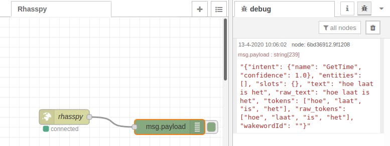 Rhasspy herkent nu wat je zegt en achterhaalt de bedoeling daarachter, maar doet er nog niets mee. Gelukkig ondersteunt Rhasspy diverse manieren om op je ‘intents’ te reageren. Standaard stuurt Rhasspy bij het herkennen van een intent een event met JSON-code uit via een WebSocket. Je kunt dan in een ander programma naar deze WebSocket-events luisteren en daarop reageren. Een handig programma daarvoor is Node-RED, dat je ook eenvoudig op je Raspberry Pi met Docker installeert.