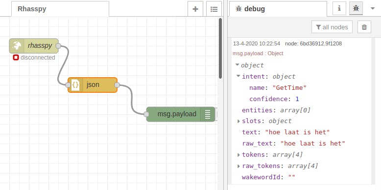 Maar eerst dienen we de JSON-string (een reeks tekens) naar een JSON-object om te zetten. Sleep een node json uit het onderdeel parser en plaats die tussen de websocket- en debug-nodes. Daarvoor dien je de bestaande verbindingen te verwijderen (selecteer en druk op Delete) en nieuwe verbindingen te maken. Als je nu weer op Deploy klikt en tegen Rhasspy praat, zie je in het debug-venster de intent in de vorm van een object in plaats van een string. Onderdelen kun je nu uitklappen, bijvoorbeeld het deelobject intent met daaronder name die de naam van de herkende intent bevat, zoals “GetTime”.