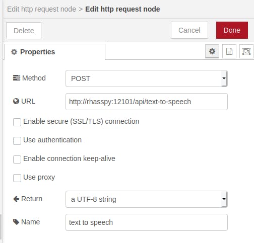 Hang nu een node switch (uit function) achter de json-node en dubbelklik erop. Vul bij Property de eigenschap msg.payload.intent.name in en vul bij de regel onderaan achter == niets in, omdat een niet herkende zin een intent zonder naam krijgt. Klik op Done. Voeg achter de switch-node een node change (uit function) toe, dubbelklik erop en zet de payload op Wat zei je?. Geef de node eventueel een naam en klik op Done. Hang achter deze node een node http request (uit network), verander de methode naar POST en vul bij de url http://rhasspy:12101/api/text-to-speech in. Klik op Done en dan Deploy.
