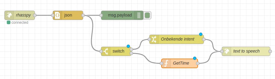 Als je nu iets zegt dat Rhasspy niet verstaat, antwoordt hij “Wat zei je?”. Door nu aan de switch andere regels toe te voegen, kun je voor elke herkende intent een andere actie laten uitvoeren. Klik in de eigenschappen van de switch-node op het knopje +add onderaan om een regel toe te voegen en vul in het veld na het isgelijkteken GetTime in. Er verschijnt nu een extra uitgang aan de switch-node. Hang daar een node function (in het onderdeel function) achter en verbind die ook met je http request. Dubbelklik op de intent en geef die de naam GetTime.