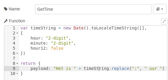 In de function-node schrijf je een javascript-functie, die de tijd uitvoer als een tekst, die door de http request aan Rhasspy wordt doorgegeven om uit te spreken. In die functie maak je eerst een variabele timeString, waaraan je de uitvoer van de methode toLocaleTimeString op een nieuw Date-object toekent. Op het einde van de functie geef je de payload terug, waaraan je de string “Het is” en de tijd toekent. In die tijd vervang je de dubbele punt (:) door de string “ uur “. Als je deze node nu opslaat en de flow uitvoert via Deploy, antwoordt Rhasspy je op je vraag hoe laat het is.