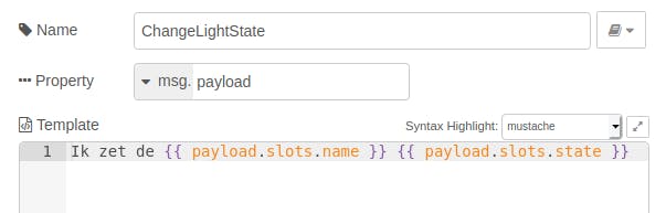 GetTime is een eenvoudige intent, maar complexere intents zoals ChangeLightState bevatten ook slots. Die kun je eenvoudig uit de JSON-code halen in Node-RED. Voeg een nieuwe regel in de switch-node toe en test op ChangeLightState. Hang hieraan een node template (in het onderdeel function) en verbind die ook weer met de http request. Vul in het tekstveld template de code Ik zet de {{ payload.slots.name }} {{ payload.slots.state }} in. Hiermee antwoordt Rhasspy je “Ik zet de woonkamerlamp aan”, als je “Zet de woonkamerlamp aan” vraagt, en hetzelfde voor andere apparaten en toestanden die voor de intent zijn gedefinieerd.