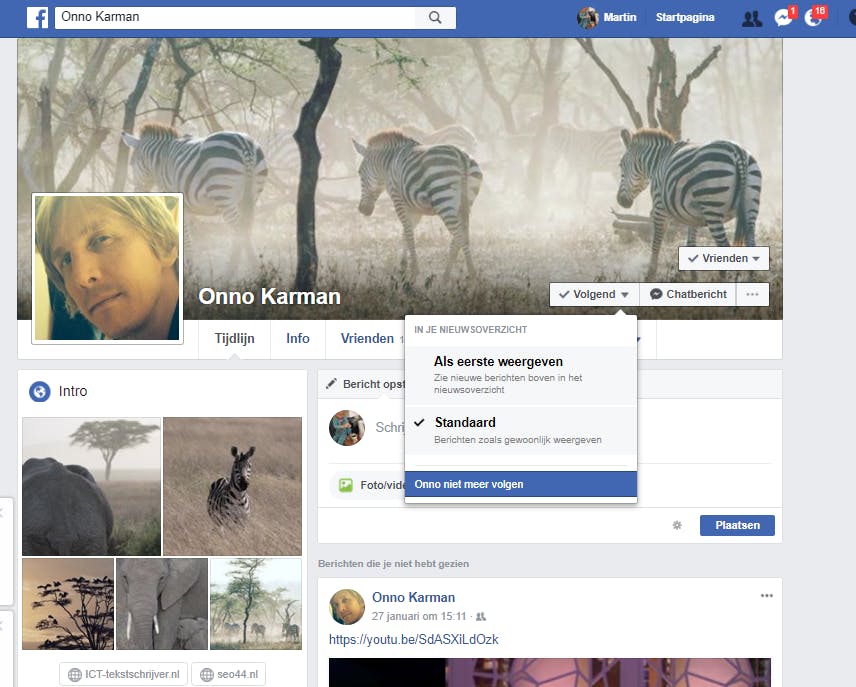 Er zijn natuurlijk ook mensen die je best aardig vindt, maar die soms dingen posten die jij niet op je tijdlijn wilt hebben (bijvoorbeeld politieke meningen of plaatjes die niet geschikt zijn voor jeugdige ogen terwijl jij vaak even lekker op de bank zit te Facebooken met kinderen om je heen). Dan is ontvrienden misschien wat rigoureus (zeker als het om familie gaat), maar dan is ontvolgen een prima optie. Bij ontvolgen blijf je vrienden op Facebook, maar krijg je de content van de persoon in kwestie simpelweg niet meer te zien op je tijdlijn. Om dit te doen, navigeer je naar de pagina van de persoon in kwestie en klik je op de knop Volgend. In het menu dat uitklapt klik je op <Naam> niet meer weergeven. Ook hiervan krijgt de persoon in kwestie geen enkele melding.