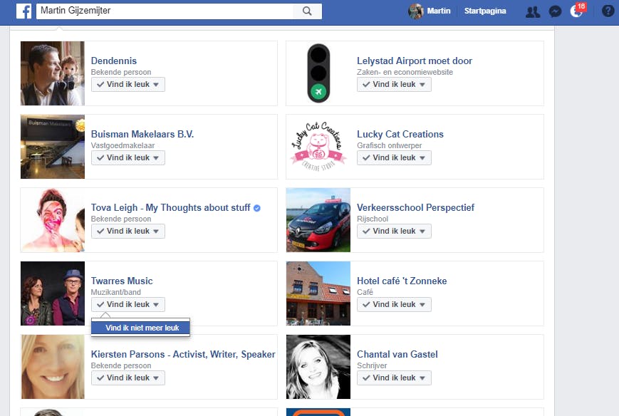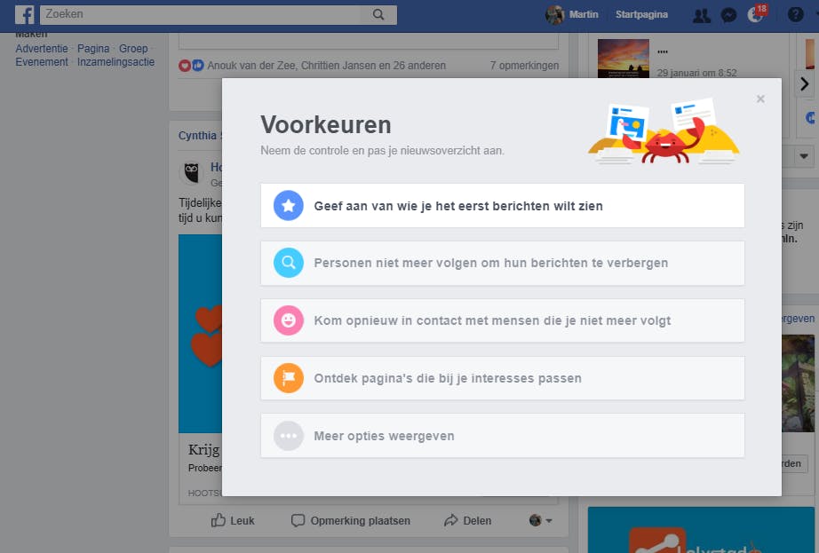 We hebben ons nu vooral gericht op alle dingen die je niet wilt zien. Maar wist je dat je ook veel controle hebt over alles dat je wél wilt zien? Je doet dat door de voorkeuren van je nieuwsoverzicht aan te passen. Die optie vind je door in Facebook te klikken op het pijltje rechtsboven (naast het vraagteken) en daarna op Voorkeuren voor nieuwsoverzicht. Wanneer je bovenin klikt op Geef aan van wie je het eerst berichten wilt zien, kun je precies aangeven wiens berichten je nooit meer wilt missen. Zeker met het nieuwe algoritme van Facebook zal dat veel verbetering opleveren.