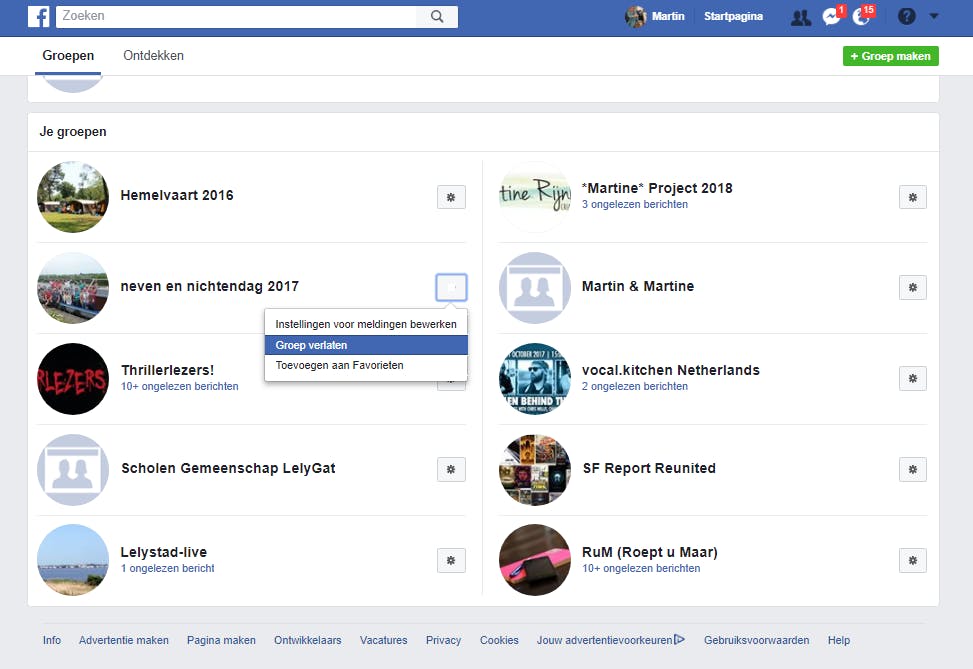 De algoritmewijziging die Facebook heeft doorgevoerd, heeft vooral betrekking op pagina’s en veel minder op groepen. Dat betekent dus dat je juist meer van groepen te zien zult krijgen, zeker als je het aantal vrienden hebt gereduceerd (omdat er nu dus meer ruimte ontstaan is op je tijdlijn). De hoogste tijd dus om ook uit groepen te stappen waar je niet per se in hoeft te zitten. Je doet dit wederom via het menu Meer op je profielpagina, en ditmaal kies je daar voor Groepen. Klik op het potloodje naast een groep waar je niet meer in wilt zitten en klik vervolgens op Groep verlaten.