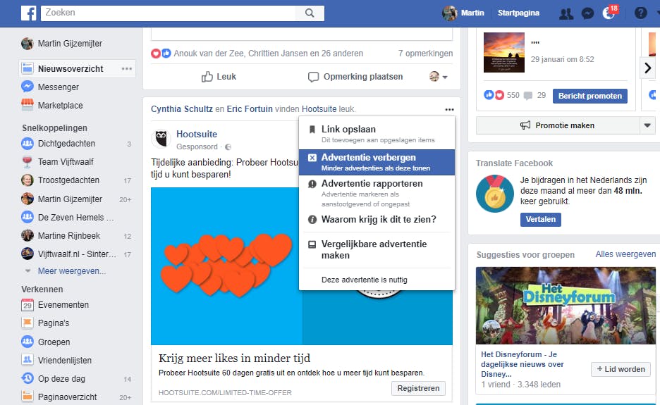 We hebben besproken hoe je vrienden en pagina’s verwijdert, maar dat wil niet zeggen dat je nooit meer berichten voor je kiezen krijgt die je niet wilt. Zo kan het heel goed zijn dat je telkens een advertentie te zien krijgt waar je helemaal geen behoefte aan hebt. Advertenties zijn niet te vermijden, je betaalt immers niets voor Facebook, maar het is zaak dat adverteerders hun berichten zo afstemmen dat ze er niemand mee lastigvallen. Doen ze dat niet goed, dan hoef je je niet bezwaard te voelen om hun berichten te verwijderen/verbergen. Je doet dat door rechtsboven in het bericht op de drie puntjes te klikken en vervolgens op Advertentie verbergen. Je kunt dan precies aangeven waarom je deze advertentie niet wilt zien. Je krijgt daardoor niet minder advertenties, maar wel leukere berichten die beter op jouw wensen zijn afgestemd.