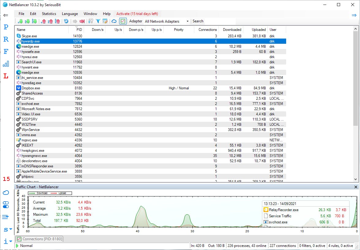 Op www.seriousbit.com vind je de gratis en de betaalde pro-versie. Start en volg de setup-wizard. Tijdens de installatie krijg je de vraag om twee drivers te installeren. Dat moet je toestaan. Je kunt daarna NetBalancer opstarten via de snelkoppeling op het bureaublad of via het pictogram in het systeemvak. In het hoofdvenster zie je aan de linkerkant alle programma’s en processen die op dat moment actief zijn in het systeem.